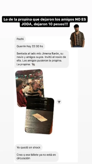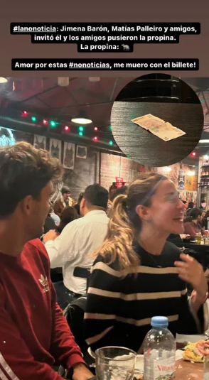 “Pochi” -como se la conoce en redes- agregó el texto: “Jimena Barón, Matías Palleiro y amigos, invitó él y los amigos pusieron la propina”.