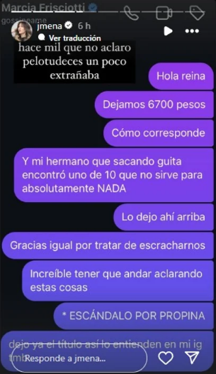 En cuanto Jimena Barón descubrió las historias, no dudó en responder. “La Cobra” apuntó: “Hola reina. Dejamos $6700 como corresponde. Mi hermano sacando guita encontró uno de ($)10 que no sirve para absolutamente nada”.