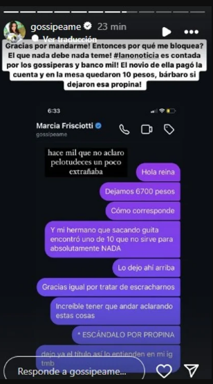 Frente a esto, Frisciotti acotó: “Gracias por mandarme, entonces, ¿por qué me bloqueas?. El que nada debe, nada teme”.