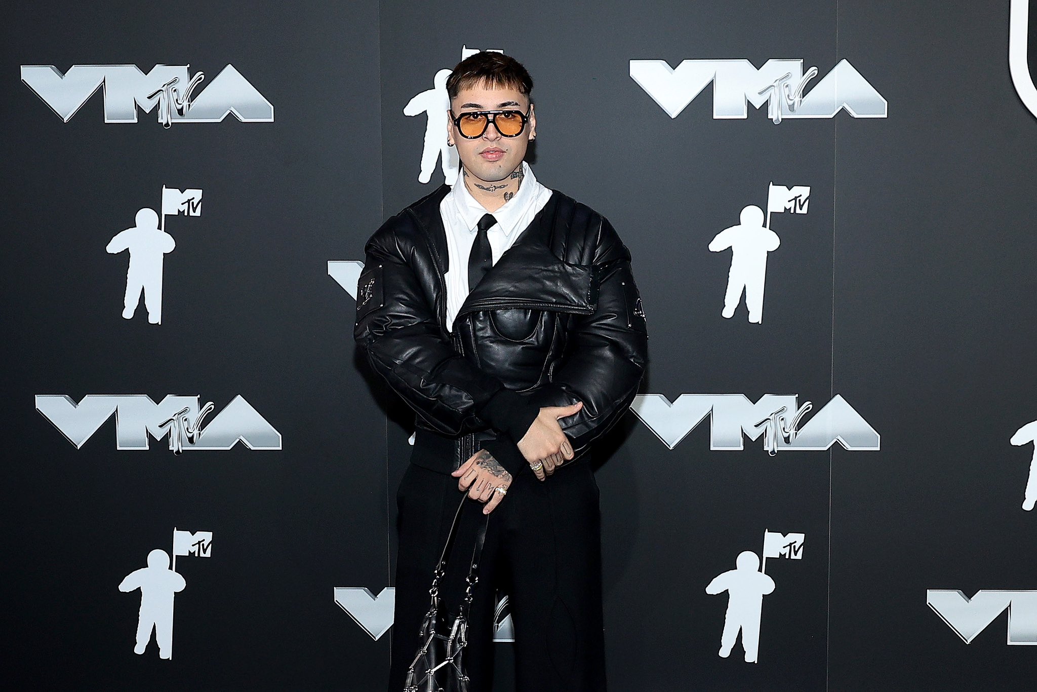 Tiago PZK arribó a los VMA’s luciendo un traje con el estilo urbano que lo caracteriza. Una chaqueta negra bomber asimétrica, pantalón sastrero, un bolso que combina y unos lentes amarillos.