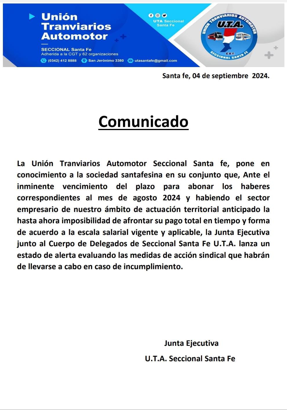 La Unión Tranviarios Automotor (UTA) Seccional Santa Fe declaró el estado de alerta ante el posible incumplimiento por parte de los empresarios del pago en tiempo y forma de los salarios correspondientes a agosto.
