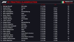 Colapinto arrancó de gran manera su participación en el GP de México. En lo que fue la primera práctica, logró un tiempo 1:19.109, el cuál consiguió con llantas blandas y ubicarse en el decimoprimer puesto. El argentino quedó a 1.111 de George Russell, quien terminó en el primer lugar con una marca de 1:17.998.