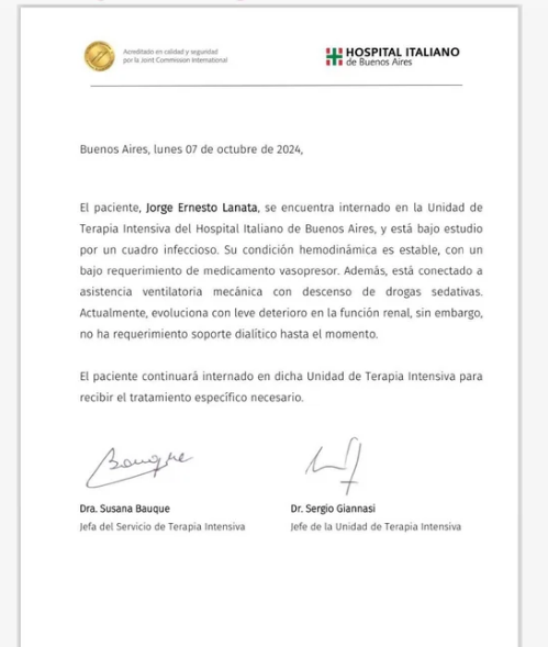 Según detalla el documento compartido por Elba Marcovecchio, Lanata quedó internado en la unidad de terapia intensiva tras presentar “un cuadro infeccioso”.
