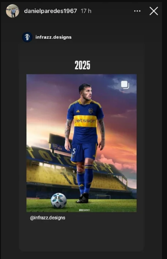 Daniel Paredes compartió en sus redes sociales una publicación con un diseño del futbolista de la Selección argentina vistiendo la camiseta de Boca, con la pelota en sus pies, desde la Bombonera y el año 2025.