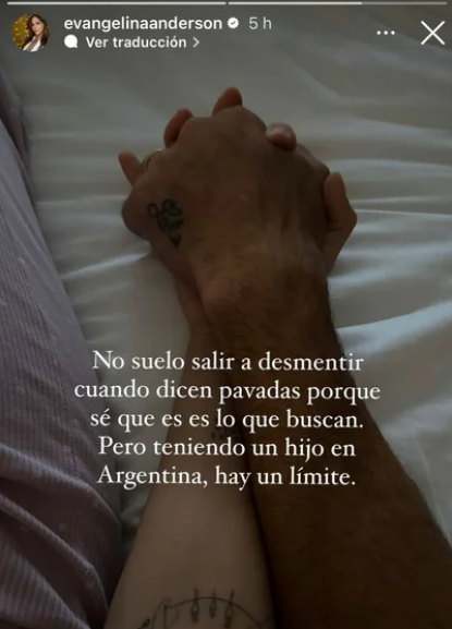 “No suelo salir a desmentir cuando dicen pavadas porque sé que es lo que buscan. Pero, teniendo un hijo en Argentina hay un límite”, escribió Anderson junto a una foto de ella y Demichelis agarrados de la mano.