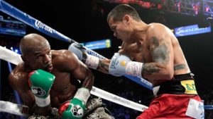 El sábado 3 de mayo de 2014, Maidana combatió contra el invicto estadounidense Floyd Mayweather Junior, en el MGM Grand Las Vegas (estado de Nevada).Después de la pelea, el Chino dijo que se sintió vencedor de la pelea, y que la revancha se la tenía que dar a Mayweather porque la pelea la había ganado él. El 13 de septiembre de 2014, Marcos Maidana peleó la revancha contra Floyd Mayweather en el mismo escenario en la ciudad de Las Vegas. A diferencia de la vez anterior, la derrota se produjo en fallo unánime dado que las tarjetas acusaron 115-112, 116-111 y 116-111 a favor del estadounidense.