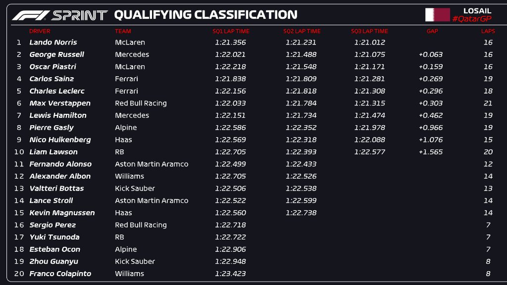La carrera sprint otorga 8 puntos al ganador, 7 para el segundo, 6 para el tercero y así hasta el octavo (no puntúan el 9º y 10º clasificados). Ayer, el más rápido fue el británico Lando Norris que registró el mejor tiempo con 1:21:012.