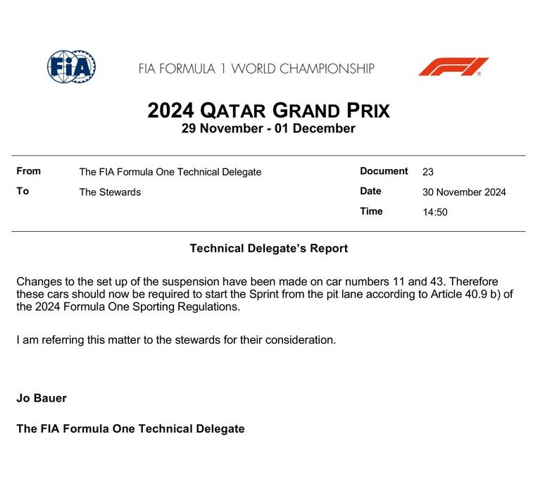 Franco Colapinto partirá desde el pit lane este sábado por la mañana en la carrera sprint del Gran Premio de Catar. La FIA confirmó que el argentino largará desde la calle de boxes la carrera sprint debido a cambios en la suspensión delantera en el Williams.