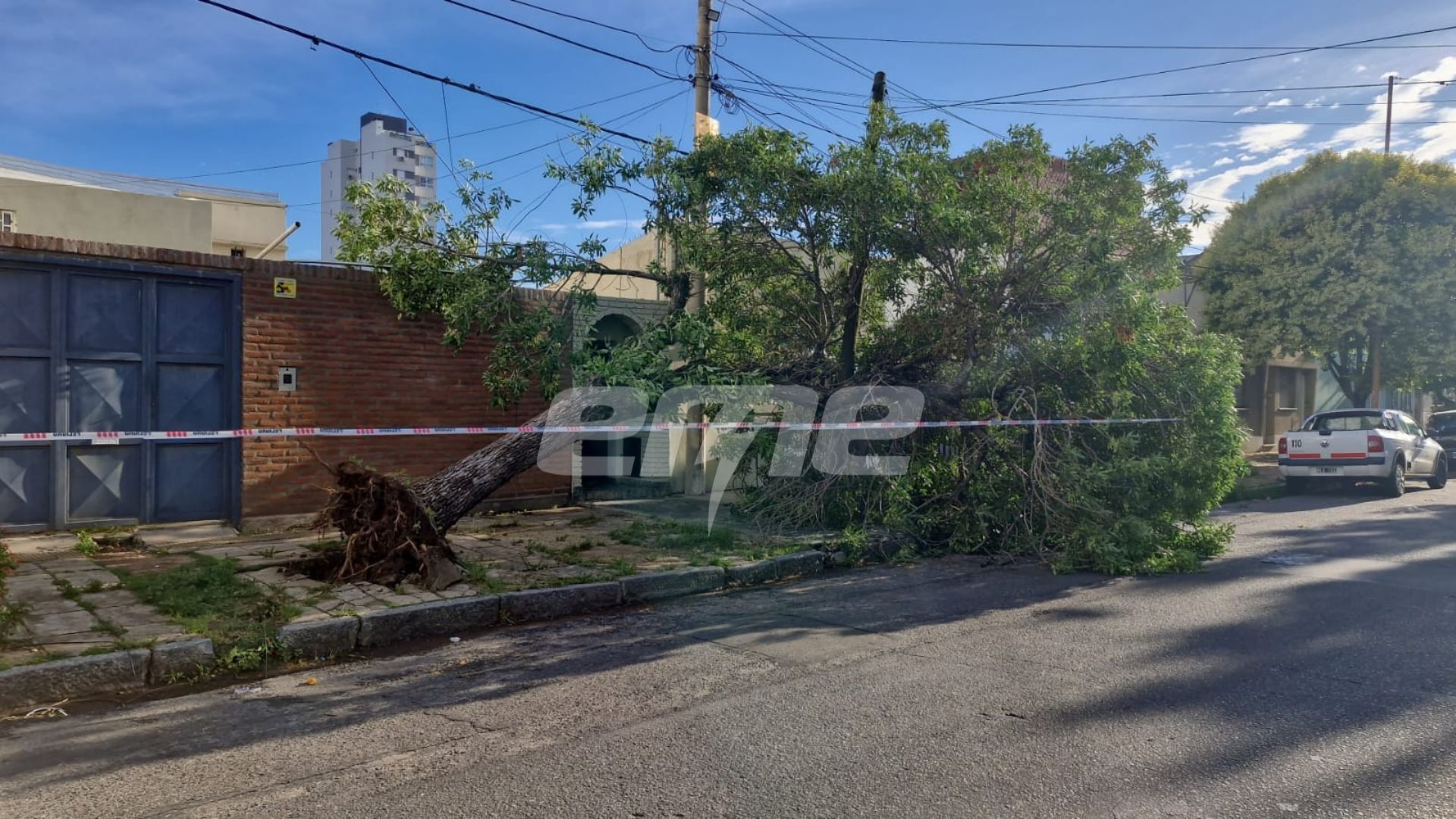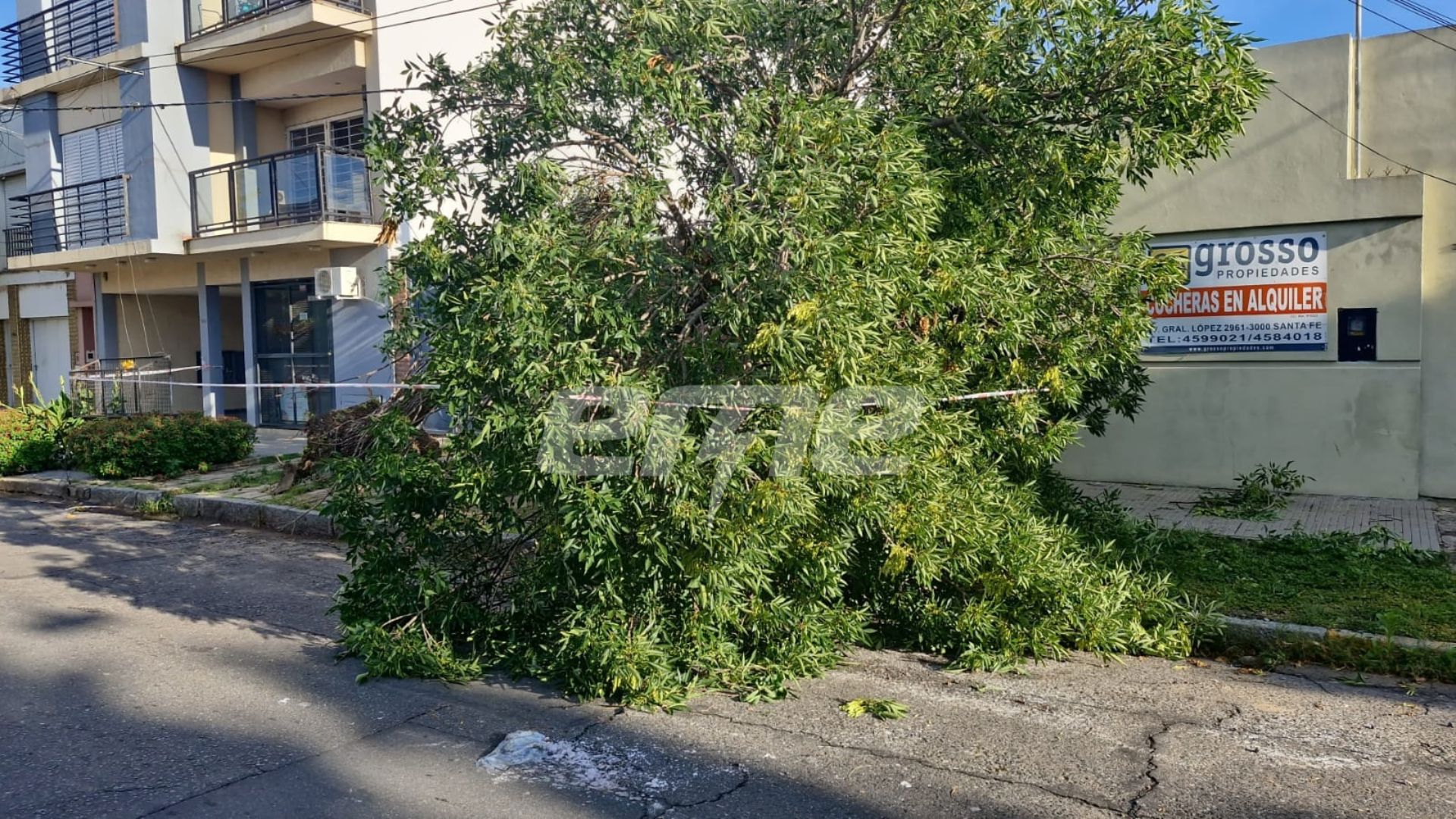 Uno de los puntos afectados fue barrio Sur, dónde múltiples inconvenientes se registraron desde anoche. Un árbol cayó en medio de San Lorenzo al 1.400, producto de la tormenta. Esto causó un corte de tránsito total y la rotura de cableado eléctrico.