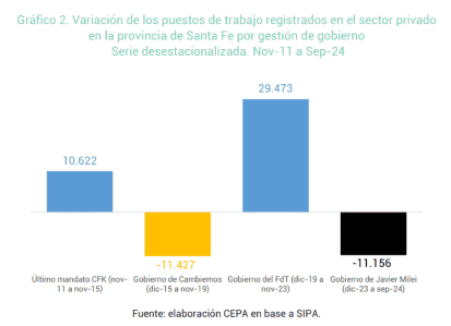 Por otra parte, desde Cepa destacaron que, en los últimos diez años, la evolución del empleo registrado privado no fue homogénea en la provincia: «en el último gobierno de CFK, se generaron 10.622 puestos; Durante el gobierno de Mauricio Macri, se destruyeron 11.427; y En el gobierno de Alberto Fernández, se generaron 29.473. En los primeros 10 meses bajo el gobierno de Milei, ya se destruyeron los mismos puestos que durante el macrismo».