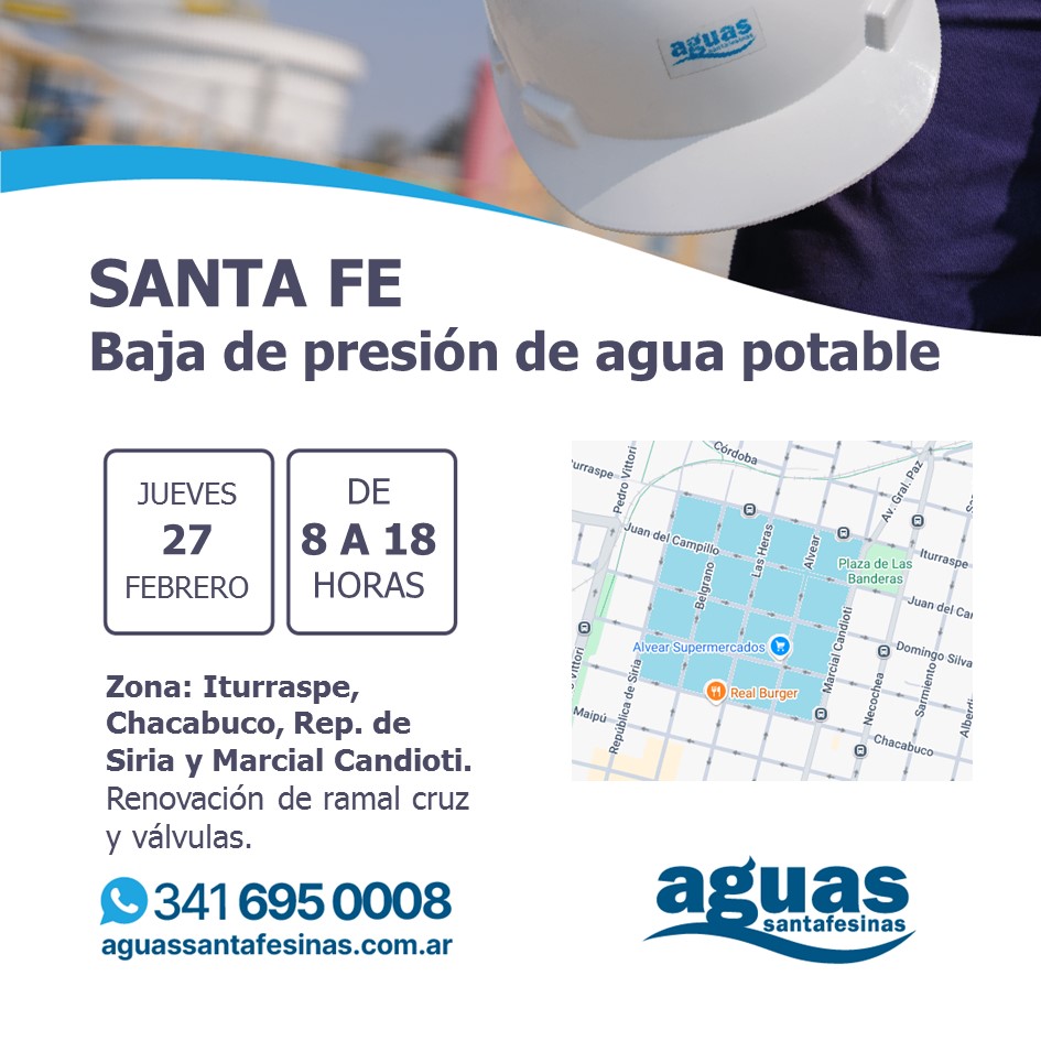 Aguas Santafesinas informó a los usuarios que mañana jueves 27 de febrero entre las 08:00 y las 18:00 se registrará una disminución en la presión del suministro de agua potable. El motivo es la renovación de una pieza especial de la red de distribución de agua potable.