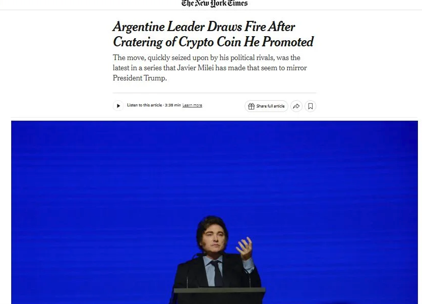 “Líder argentino genera críticas tras el cráter de la criptomoneda que promovió”, titula una nota en su edición dominical el influyente diario norteamericano The New York Times.