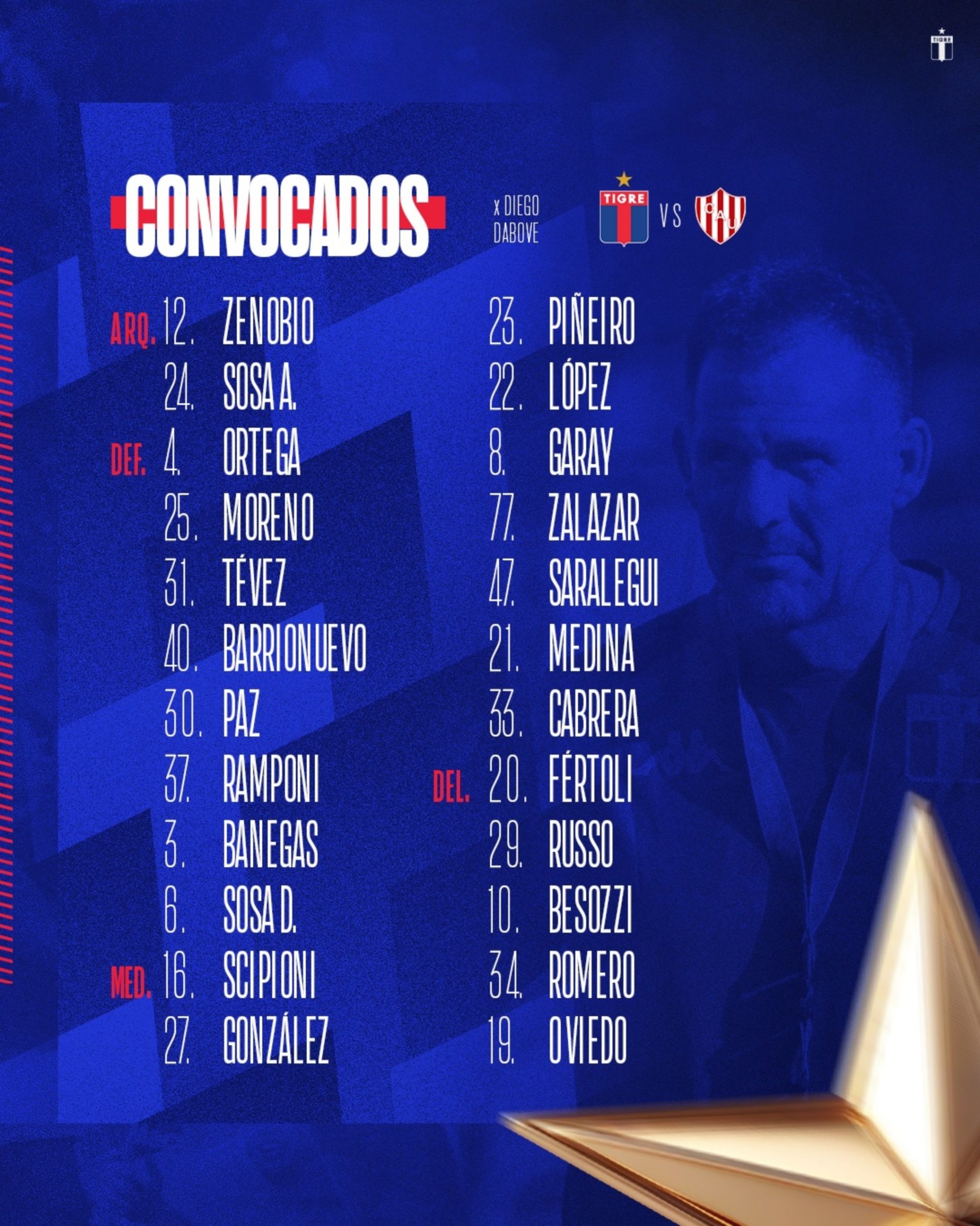 Tigre: 12- Felipe Zenobio/ 4- Martín Ortega, 37- Jeremías Ramponi, 30 – Nehuén Paz y 3- Nahuel Banegas/ 8- Martín Garay, 16- Lorenzo Scipioni, 22- Julián López y 21- Sebastián Medina/ 33- Víctor Cabrera y 29- Ignacio Russo. DT: Diego Dabove.