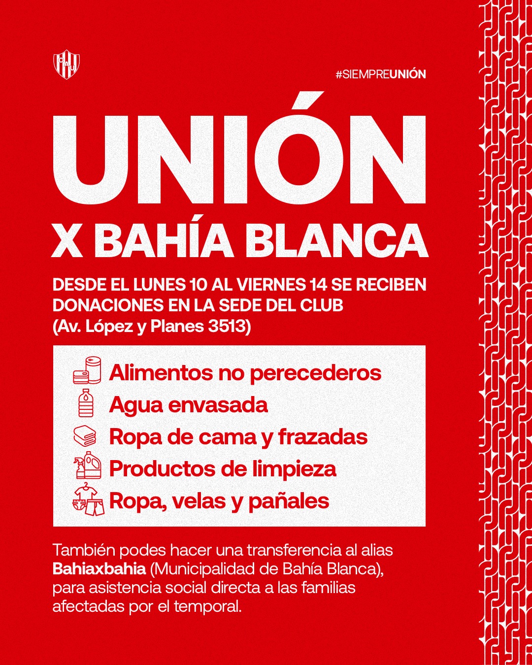 Por su parte, Unión también se suma como punto de donación desde hoy lunes 10 hasta el viernes 14 en la sede de Avenida López y Planes 3513.