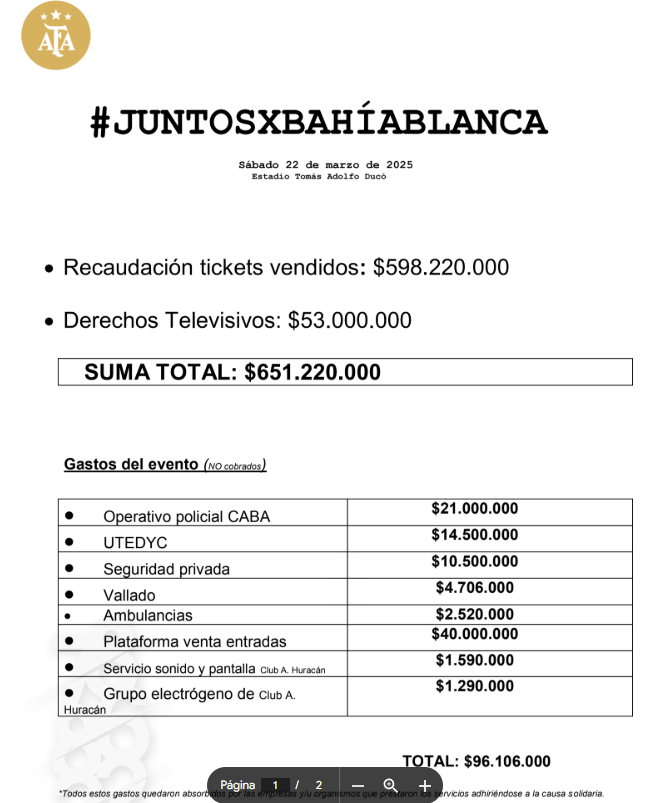 Al mismo tiempo, el organismo confirmó «todos los gastos quedaron absorbidos por las empresas y/u organismos que prestaron los servicios adhiriéndose a la causa solidaria», luego de la polémica con el Gobierno de la Ciudad de Buenos Aires quien en un principio tenía estipulado cobrar el operativo policial realizado y en las últimas horas, dio marcha atrás con la decisión.