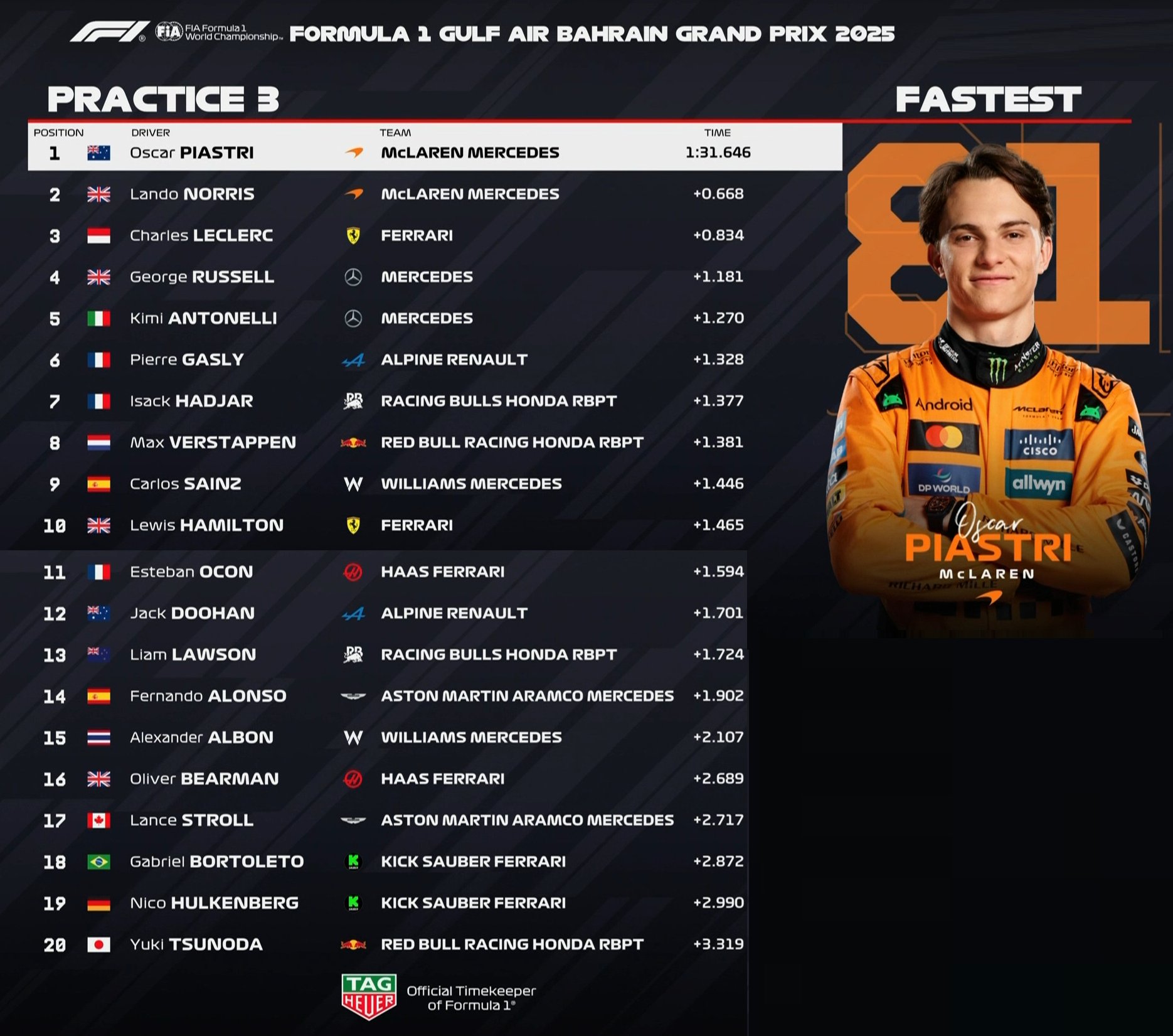 La clasificación será este sábado desde las 13 hora argentina en donde, por lo mostrado hasta el momento, la pole será cuestión de dos entre los Mc Laren. Piastri, que está cumpliendo este fin de semana 50 Grandes Premios, marcó la mejor vuelta con un tiempo de 1:31:646, 668 milésimas mas rápido que Lando Norris.