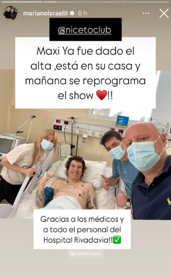Luego del accidente, el cantante fue trasladado de urgencia al Hospital Rivadavia, donde se sometió a una cirugía en la que le colocaron un clavo endomedular en el fémur para estabilizar la lesión. Su manager, Mariano Israelit, confirmó la noticia del alta médica con una publicación en redes sociales: «Maxi ya fue dado de alta, está en su casa y mañana se reprograma el show!», escribió junto a una imagen del cantante en la camilla del hospital.