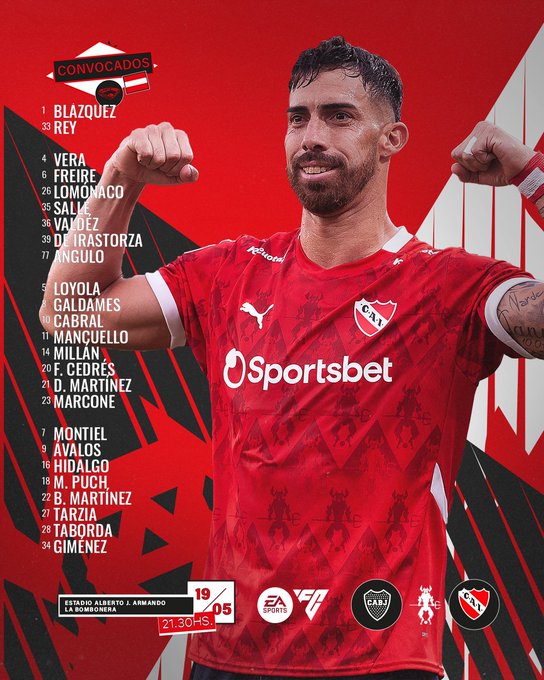Independiente: 33- Rodrigo Rey/ 4- Federico Vera, 26- Kevin Lomónaco, 36-Sebastián Valdez y 77- Álvaro Angulo/ 5- Felipe Loyola, 23-Iván Marcone y 10- Luciano Cabral/ 7- Santiago Montiel, 9- Gabriel Ávalos o 34- Matías Giménez Rojas y 27- Diego Tarzia. DT: Julio Vaccari.
