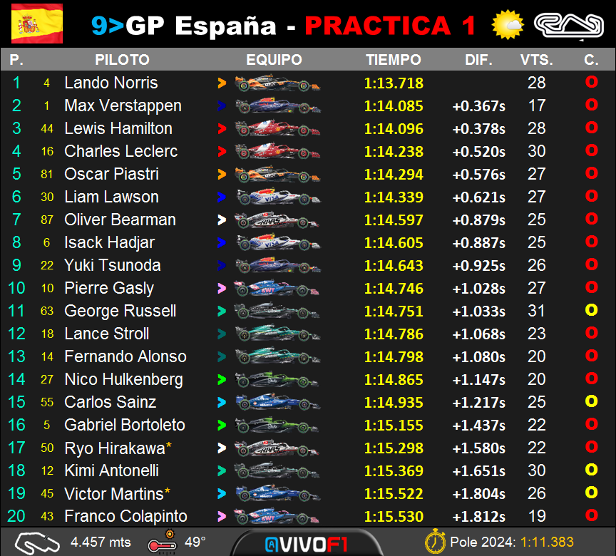3. Hamilton: +0.378#F1 #SpanishGP pic.twitter.com/j6luBPwPHZ— Formula 1 (@F1) May 30, 2025