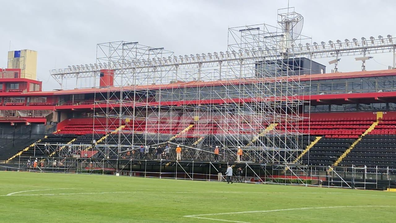 Apenas finalizó el partido de Colón frente a Estudiantes de Caseros el sábado por la tarde, comenzó el movimiento en el estadio. El montaje del escenario —de unos 60 metros de ancho— está a cargo de un staff de 60 personas, además de equipos locales de Rosario y Córdoba. También comenzaron las tareas para instalar sonido, luces y pantallas de última tecnología.