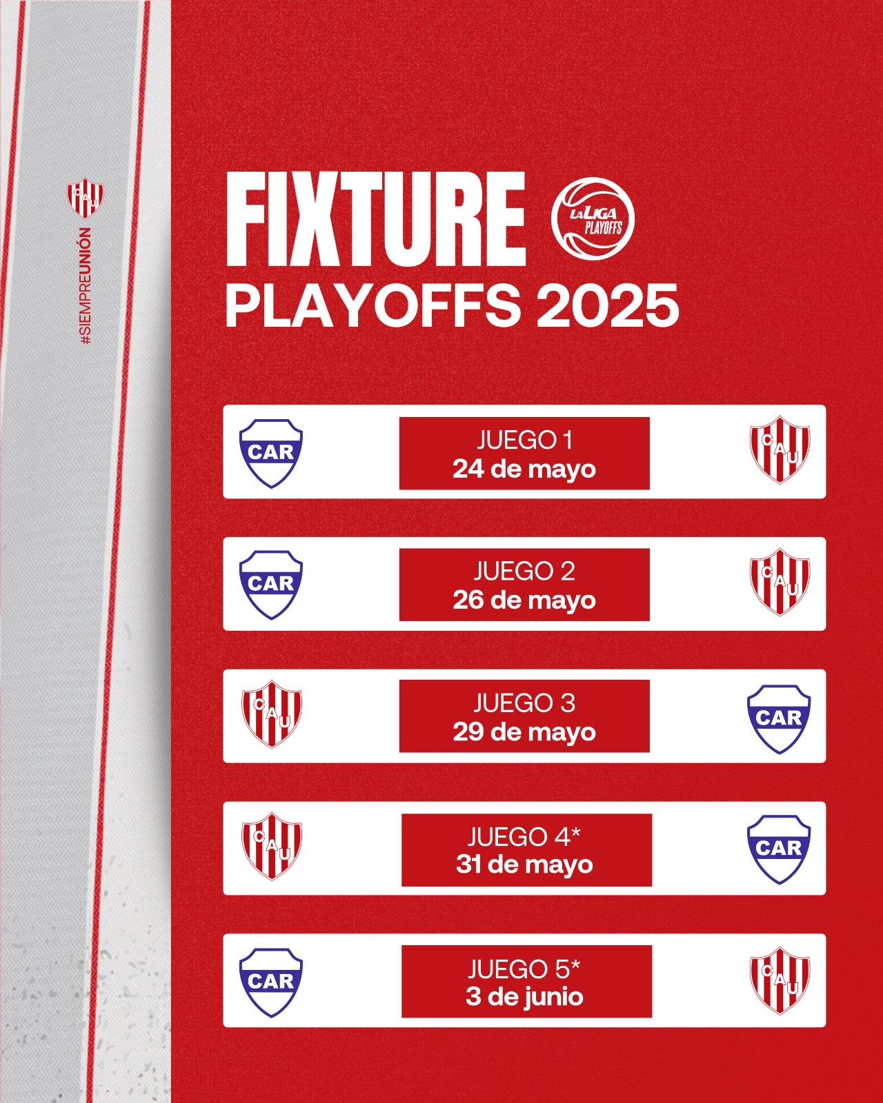 De ser necesario un cuarto, se jugará el 31 de mayo a las 21:30 nuevamente en la capital santafesina y el quinto, solo si es necesario, se definirá el martes 3 de junio en La Rioja.