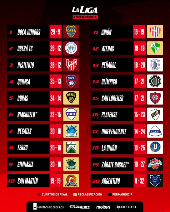 Tras cerrarse la fase regular de la temporada con 38 partidos, quedaron determinadas las posiciones finales y los 4 primeros de la tabla lograron clasificar directamente a cuartos de final. De esta manera, Boca Juniors, Oberá Tenis Club, Instituto de Córdoba y Quimsa de Santiago del Estero esperan en cuartos.