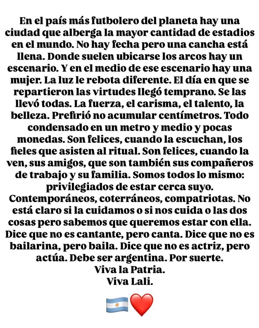 Con un cierre lleno de orgullo y emoción, añadió: “Contemporáneos, coterráneos, compatriotas. No está claro si la cuidamos o si nos cuida o las dos cosas, pero sabemos que queremos estar con ella. Dice que no es cantante, pero canta. Dice que no es bailarina, pero baila. Dice que no es actriz, pero actúa. Debe ser argentina. Por suerte. Viva la Patria. Viva Lali”.