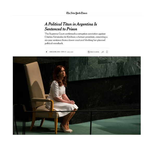 Uno de los análisis más destacados fue el del The New York Times, que tituló su artículo “Argentina’s Top Court Bans Cristina Kirchner From Office” y sostuvo que la sentencia “marca oficialmente el fin de sus aspiraciones políticas”. El diario remarcó que la exmandataria fue hallada culpable de beneficiar a empresarios cercanos con contratos públicos entre 2007 y 2015, y aunque por su edad no iría a prisión efectiva, la inhabilitación es un mensaje contundente del sistema judicial argentino.