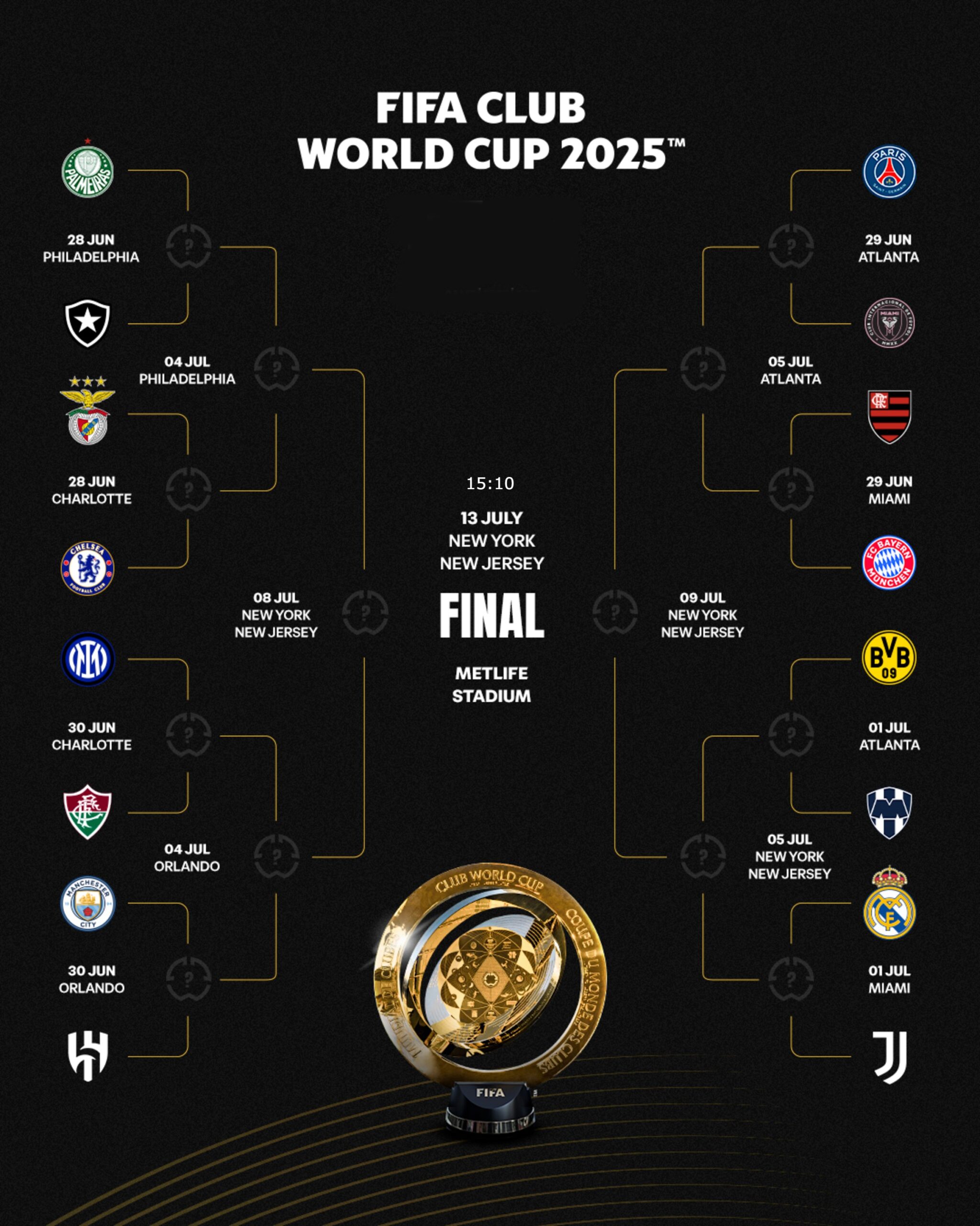 Sin equipos argentinos, tras la eliminación de Boca y River, quedan los 4 brasileños: Palmeiras, Botafogo, Fluminense y Flamengo más los dos equipos de la Concacaf: Inter Miami y Monterrey.