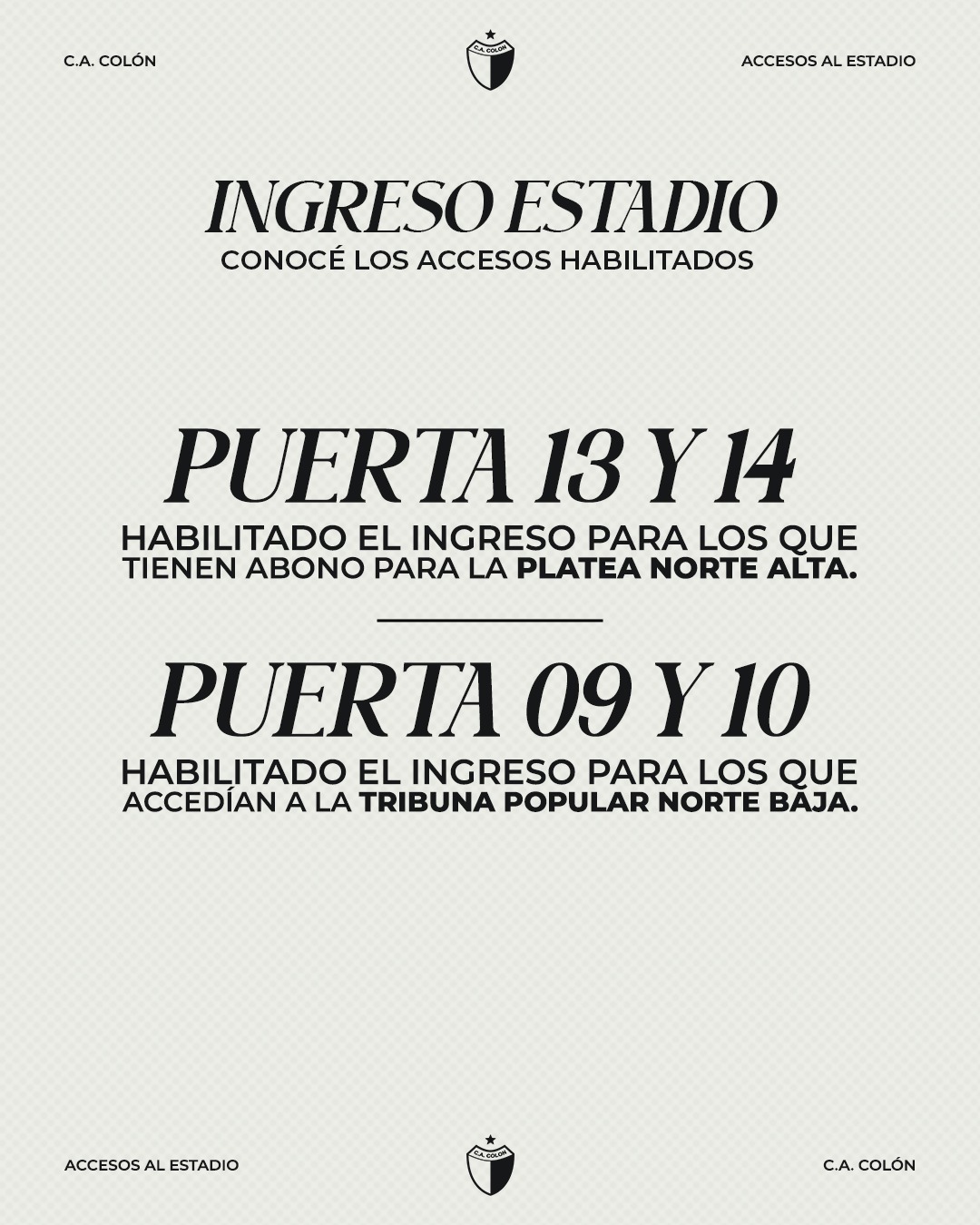El Club Atlético Colón ha comunicado oficialmente que, como consecuencia de la Resolución 142/25 emitida por la Secretaría de Seguridad Pública de la Provincia de Santa Fe, se ha determinado la prohibición de público en la Tribuna Popular Norte Baja y Platea Norte Alta para los próximos dos partidos que se disputen en condición de local.