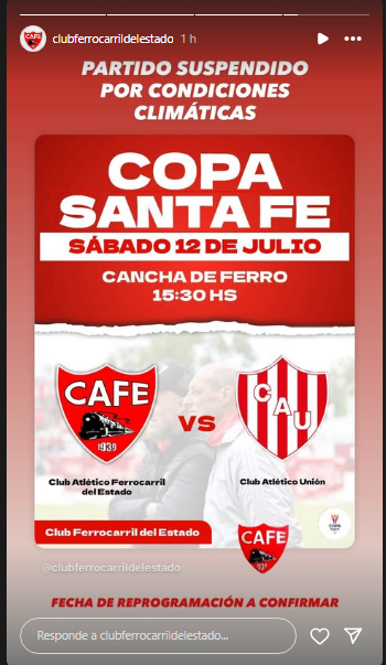 La Copa Santa Fe decidió suspender el partido previsto para hoy entre Ferrocarril del Estado y Unión de Santa Fe por los octavos de final del certamen provincial. El cotejo estaba programado para las 15:30 en el recinto de Avenida Roca y Avenida Angela de la Casa (Ruta 34).