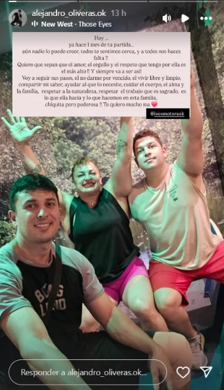 A través de sus historias de Instagram, Alejandro Oliveras posteó una foto junto a su madre y su hermano Alexis en el gimnasio: “Hoy, ya hace 1 mes de tu partida… Aún nadie lo puede creer, todos te sentimos cerca, y a todos nos haces falta!!”.