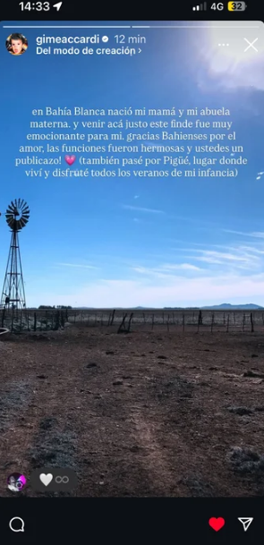 «Gracias bahienses por el amor, las funciones fueron hermosas y ustedes un publicazo. (También pasé por Pigüé, lugar donde viví y disfruté todos los veranos de mi infancia)», agregó.
