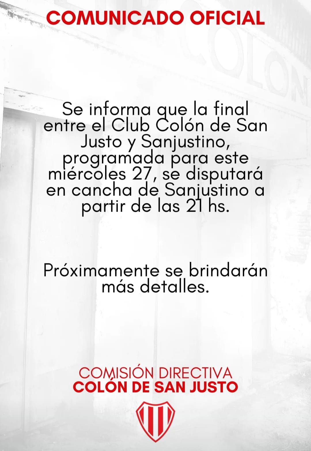 La Liga Santafesina de Fútbol realizó esta mañana en San Justo el sorteo del estadio para la final del Torneo Apertura Marcos Méndez entre Colón de San Justo y Sanjustino este miércoles 27 de agosto a las 21.