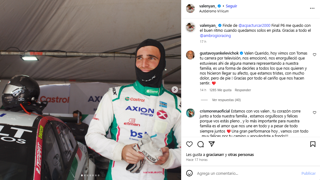 Su abuelo le dedicó un mensaje y contó cómo atraviesan este momento: “Valen Querido, hoy vimos con Tomas tu carrera por televisión, nos emocionó, nos enorgulleció que estuvieses ahí de alguna manera representando a nuestra familia, es una forma de decirles a todos los que nos quieren y nos hicieron llegar su afecto, que estamos tristes, con mucho dolor, pero de pie. Gracias por todo el cariño que nos hacen sentir”.