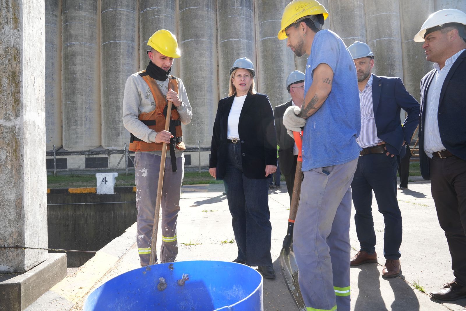 La vicegobernadora de Santa Fe, Gisela Scaglia; el ministro de Desarrollo Productivo, Gustavo Puccini; y el presidente del Ente Administrador del Puerto, Leandro González, presenciaron el embarque de 22.000 toneladas de soja que partió este jueves desde la Terminal de Agrograneles del Puerto de Santa Fe a Puerto San Lorenzo (ACA).