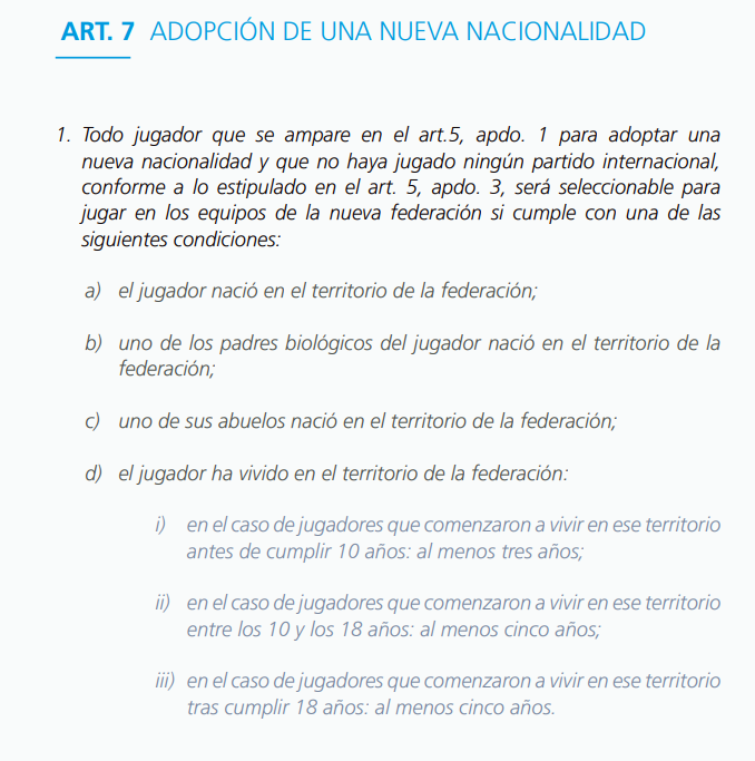 Según el reglamento de la FIFA, un jugador sólo puede jugar para una selección nacional si su padre o madre nació en ese país, sus abuelos paternos/maternos son ciudadanos o ha sido residente legal de forma continua durante al menos 5 años después de cumplir 18 años.