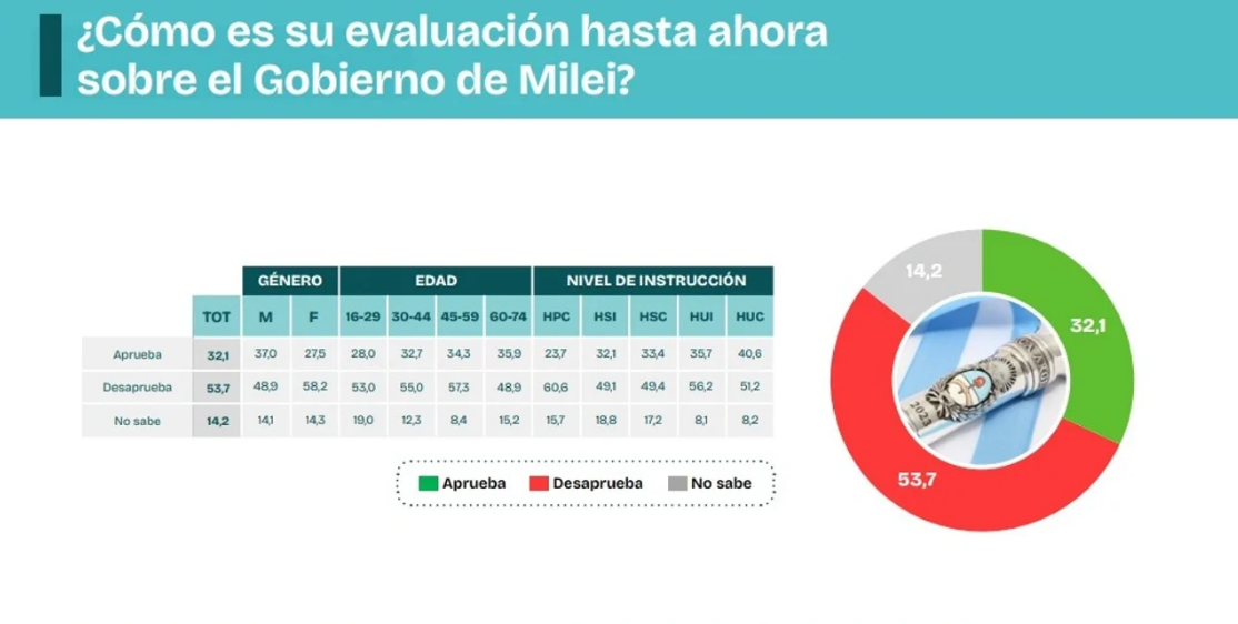 «Las evaluaciones específicas de la política económica y el resto de las materias de gestión también empeoraron (2,5 puntos) al igual que la imagen positiva del presidente Javier Milei, que cayó 3 puntos y presenta un claro diferencial negativo de 12 puntos”, se añadió.