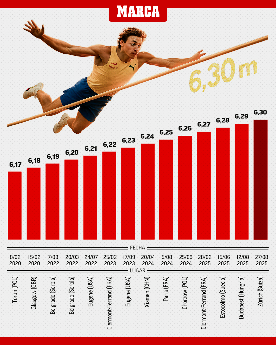 El sueco bajó por decimocuarta vez el récord mundial desde su primera vez en 2020. Desde ese torneo en Torun, Polonia, donde marcó 6,17 para superar el 6,16 del francés Renault Lavillenie logró quebrar el récord mundial 14 veces, todas de centímetro a centímetro.