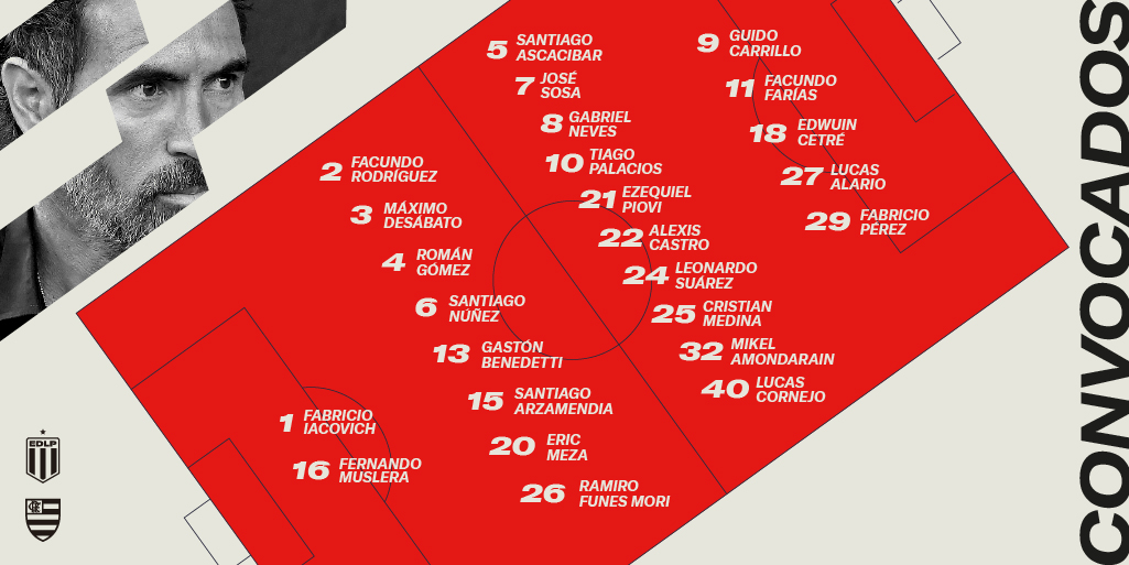 Flamengo: 1- Agustín Rossi/ 2- Guillermo Varela, 3- Léo Ortiz, 4- Léo Pereira y 26- Alex Sandro/ 21- Jorginho, 8- Saúl Iñíguez y 10- Giorgian De Arrascaeta/ 50- Gonzalo Plata, 9- Pedro y 16- Samuel Lino. DT: Filipe Luis.