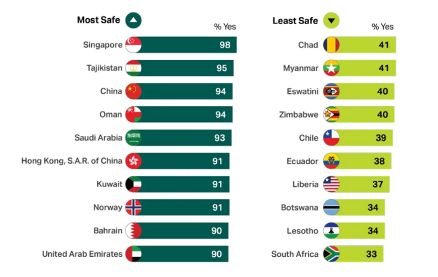 Durante 2024, el 98 % de los singapurenses afirmaron sentirse seguros al caminar solos durante la noche, una de las cifras más altas registradas por Gallup a nivel mundial. El informe destacó los resultados constantes de Singapur en cuanto a la percepción general de seguridad entre sus residentes.