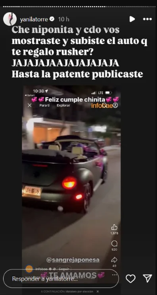 Luego, se dirigió a Instagram a dedicarle un par de Historias, recordandole a la actriz que fue ella misma quien publica sus datos: “Che niponita y cuando vos mostraste y subiste el auto que te regalo rusher? Hasta la patente publicaste”.