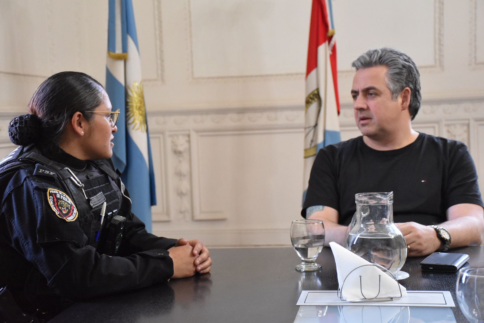El ministro de Justicia y Seguridad de la Provincia, Pablo Cococcioni, recibió este martes a la suboficial Juana Natalí Rodríguez y al jefe del Comando Radioeléctrico de Rosario, Matías Moreyra, tras el operativo realizado el domingo por la noche en Ovidio Lagos al 8500, donde por primera vez se empleó una pistola Taser en una intervención real en Santa Fe.