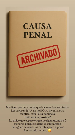 Si bien celebró que la Justicia desestime la denuncia, lamentó que su ex pareja busque perjudicarlo utilizando a sus hijos: «¿Cuál será la próxima? Lo único que espero es que no sigan usando a 5 menores porque el daño es irreparable. Se siguen cayendo las caretas poco a poco! Les mando un beso”.