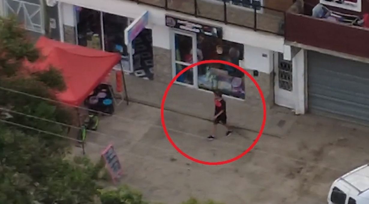 Las imágenes del drone registran cuando los dos hombres salían del inmueble con actitud sospechosa, mientras se producía la llegada de fuerzas policiales de la provincia de Santa Fe para poner en marcha el operativo en la zona de Floduardo Grandoli al 3100, ciudad de Rosario.