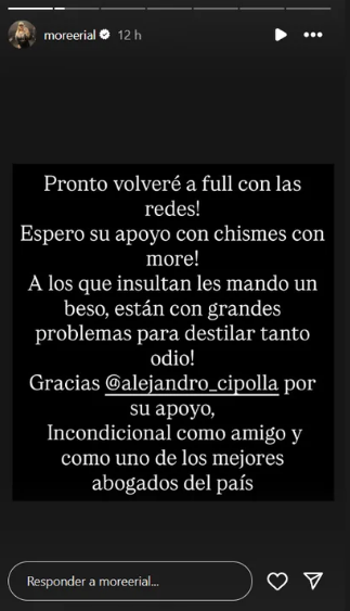 Por último, dedicó un dulce mensaje a su amigo y abogado Alejandro Cipolla por estar siempre de su lado: “A los que insultan les mando un beso, están con grandes problemas para destilar tanto odio! Gracias @alejandro_cipolla por su apoyo incondicional como amigo y como uno de los mejores abogados del país”.
