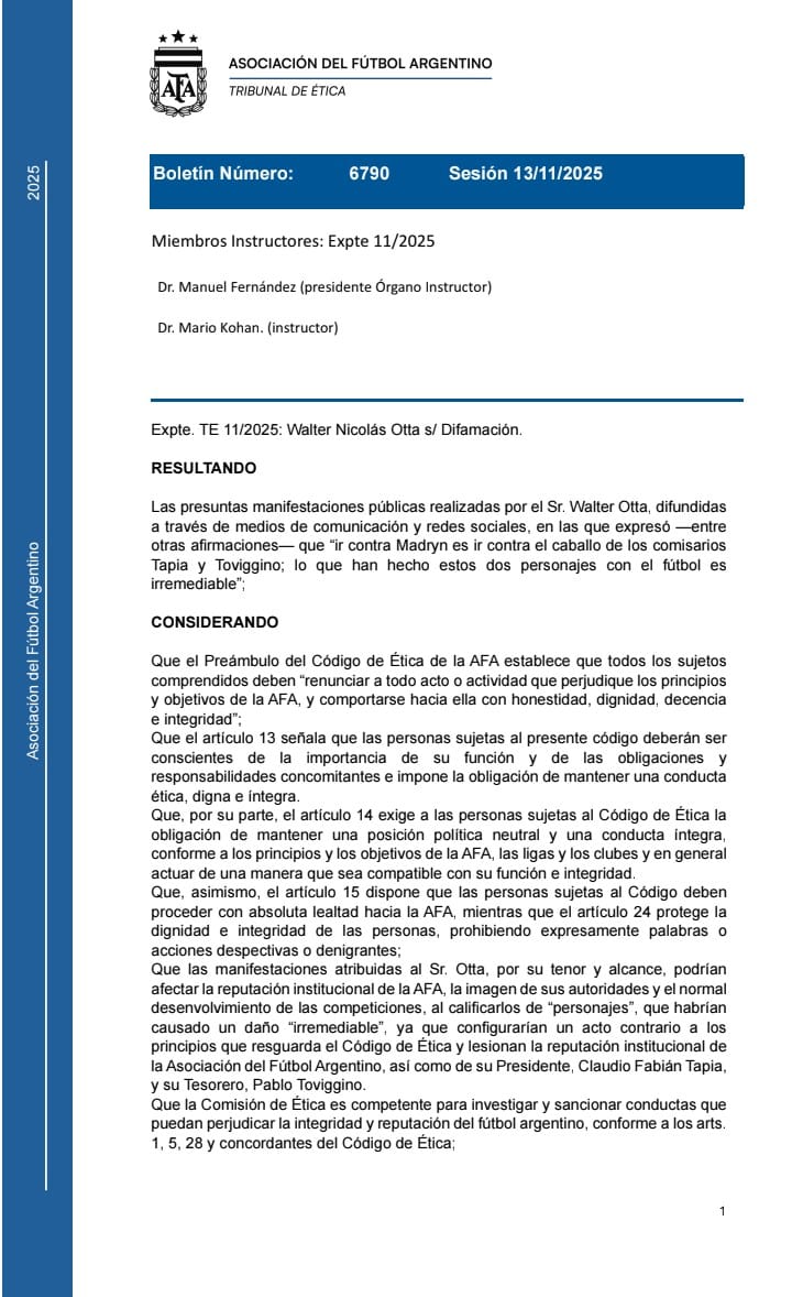 “Atentos a la comunicación recibida por parte del Tribunal de Ética de la Asociación del Fútbol Argentino, nuestro cuerpo de abogados se encuentra en estos momentos recopilando todas las pruebas que demuestran claramente que los hechos narrados no se corresponden con la realidad para luego, durante la noche, preparar el descargo correspondiente”, comenzó el escrito por parte del ‘Gallito’, disconforme con la decisión que suma un escándalo más al fútbol argentino.