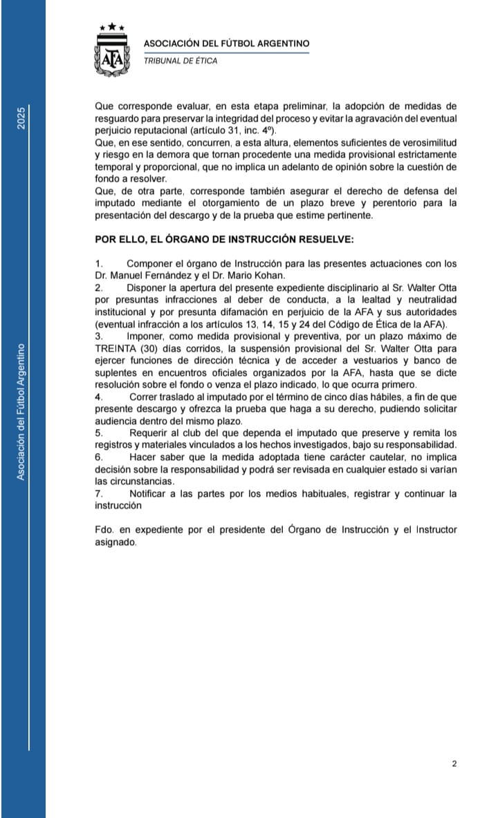 De todas formas, el Tribunal de Ética no tuvo en cuenta el comunicado de prensa y sancionó a Otta de manera provisional y preventiva por 30 días, suspendiéndolo de ejercer su trabajo y acceder al vestuario y banco de suplentes en los días de partido, además de abrirle un expediente disciplinario.