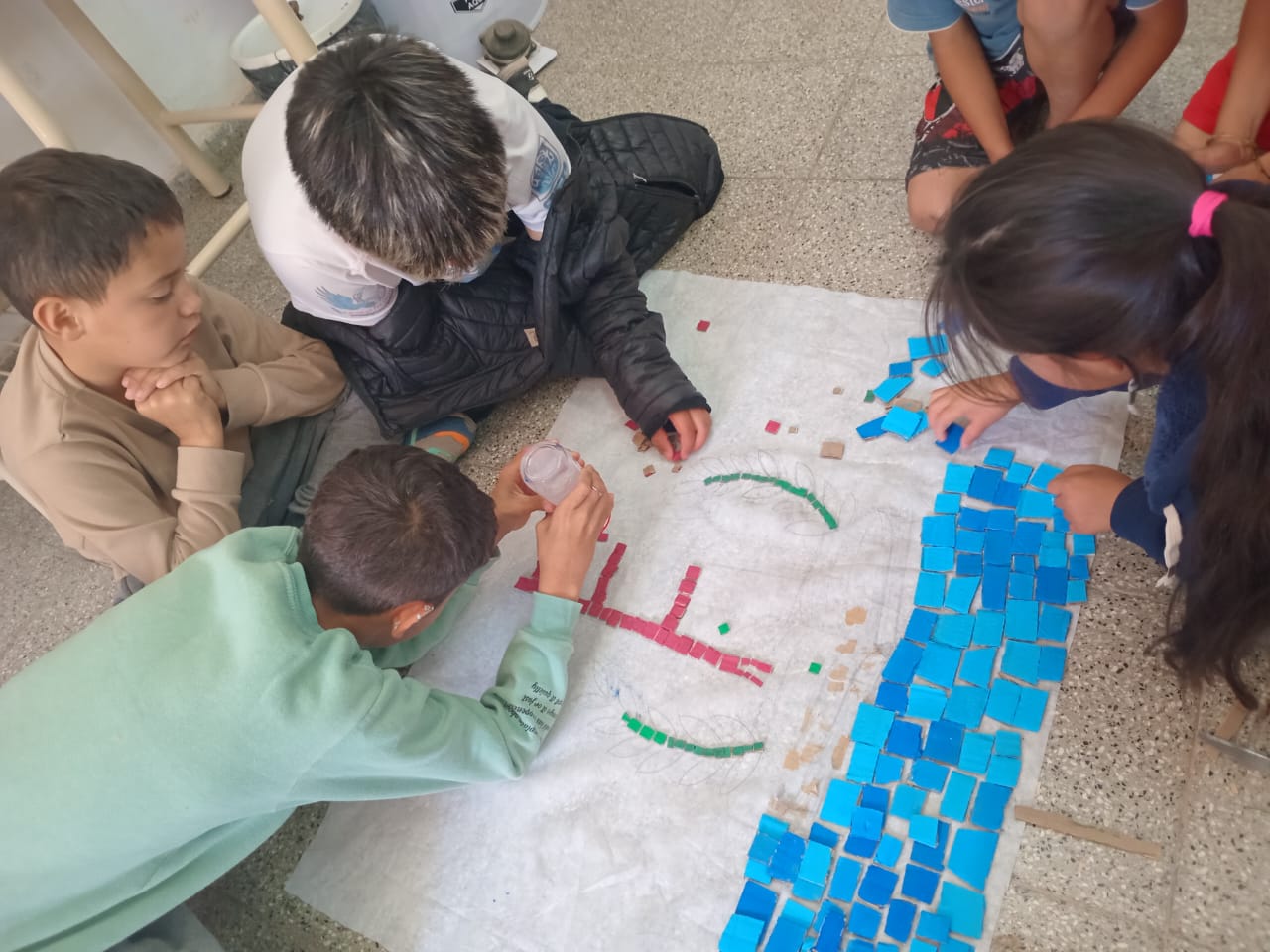 Posteriormente, la propuesta pedagógica se tradujo en actividades creativas y colaborativas que combinaron arte, historia y la identidad local. Se propuso confeccionar una bandera por Estación utilizando materiales reciclados, telas, goma eva y cartulinas. Esta actividad de confección colectiva fomentó el trabajo en equipo y el uso de técnicas diversas, como el mosaiquismo, pintura y el collage.