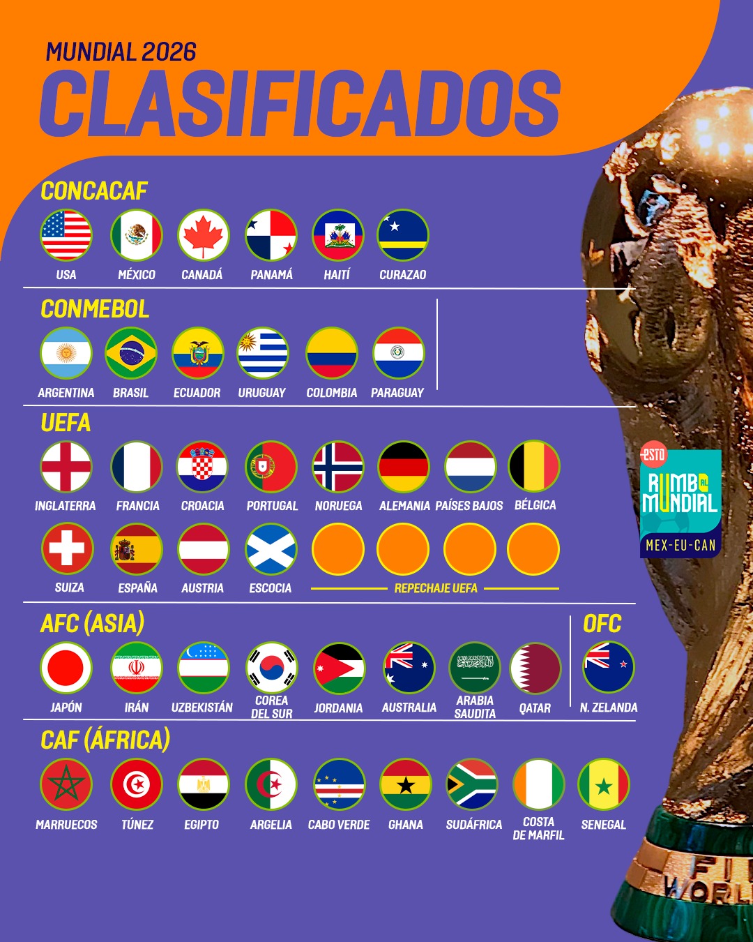 A 204 días del inicio del Mundial 2026 de Estados Unidos, México y Canadá, 42 selecciones ya aseguraron su participación. Quedarán sólo 6 lugares que se definirán en marzo de 2026 entre 22 equipos.